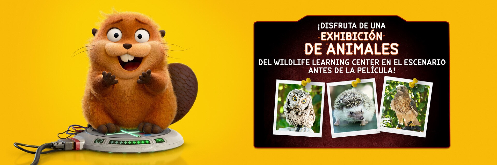 ¡Disfruta de una exhibición de animales del Wildlife Learning Center en elescenario antes de la película!
